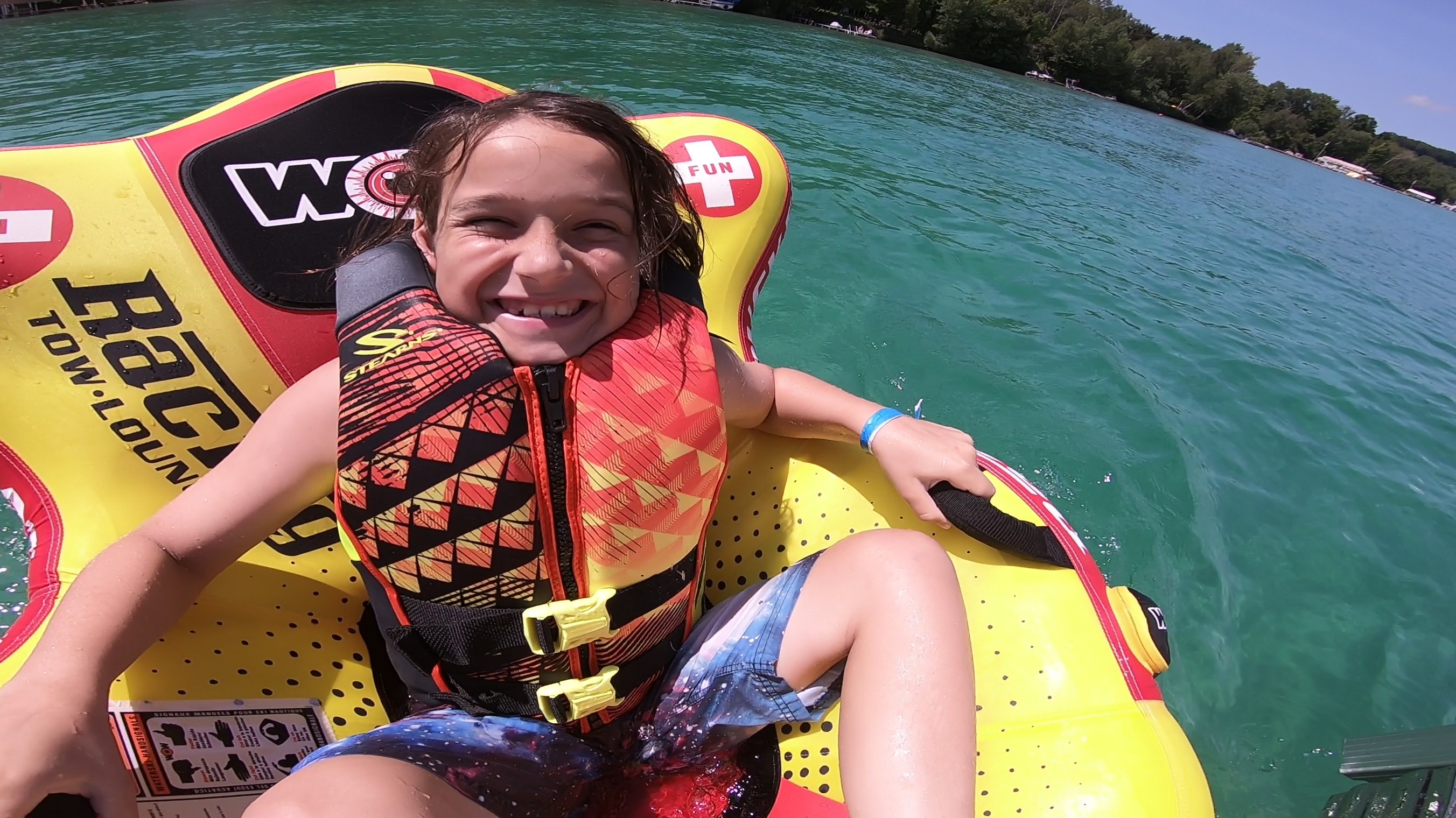 Splashing around in 6-8 feet of water doesn’t entertain kids for long and they insist that we find a deeper spot so they can jump off the boat diving board.  We decide to entertain the kids while cruising across the lake, so we pull them on tubes.