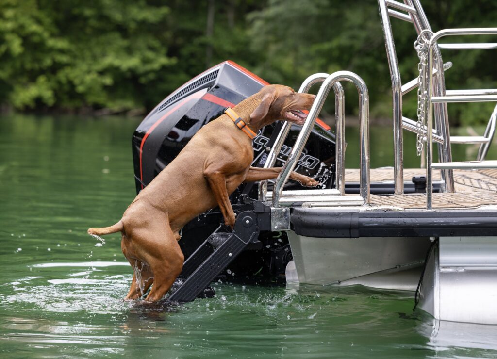 Few boating memories are better than watching your dog leap off the pontoon and splash into the water, tail wagging, ears flying, and family laughing along. But when playtime winds down and it’s time to climb back aboard, the fun can quickly shift to frustration. Traditional pontoon ladders, with their steep vertical rungs and narrow steps, make it physically impossible for dogs to use safely. Without traction beneath their paws or a gradual angle to climb, most dogs are left waiting for a lift back onto the deck.